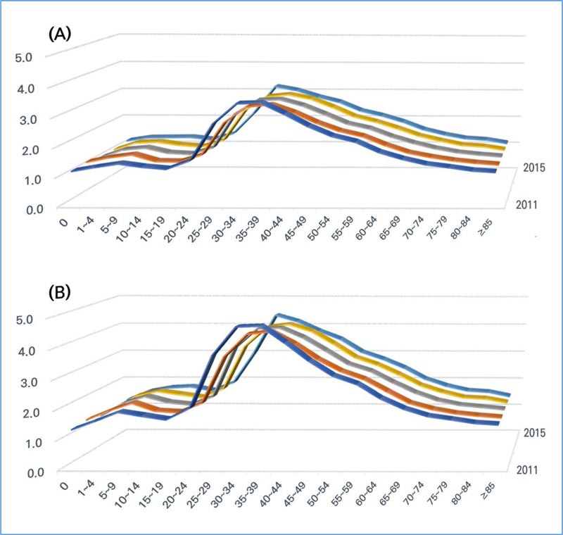 The ratio from 2011 to 2015 was consistently larger than 1 and increased at an inconsistent rate with each consecutive age group until 30-39 years, and decreased thereafter (Males: 1.09-3.47, Females: 1.07-1.95).