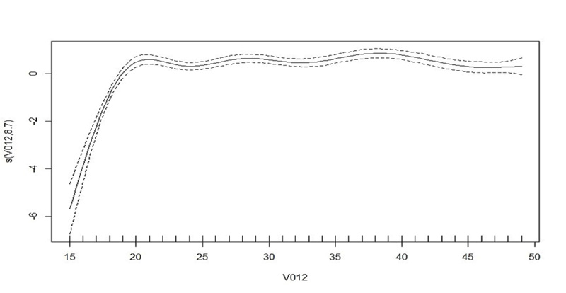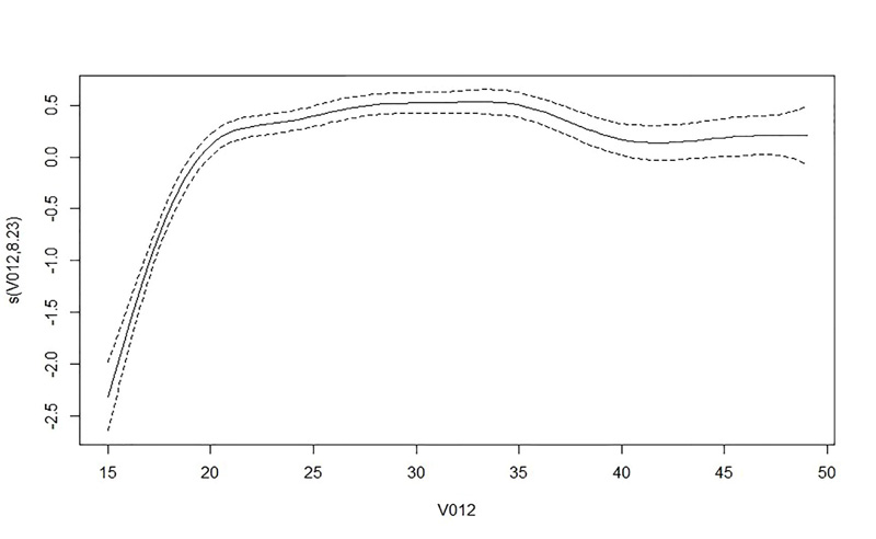 Table 6 shows that the current age of a woman has a significant impact on intimate partner violence. The letter s in Table 6 characterizes the smoothing term, and the value in parenthesis shows the predicted degree of freedom (edf). The test statistics for woman's age (33.92), together with a p-value (<2e-16), shows that there is no linear trend relation with IPV. This is affirmed in Fig. (4), where the trend shows that the age has an effect on an increase in the prevalence of IPV up to approximately 20 years, and thereafter, it remains constant until about 35 years when it starts to decrease until about 40 years; after this age, it starts to show an increase again.