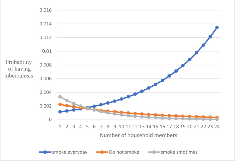 Fig. (1) suggests that up to the approximate age of 50, the risk of tuberculosis is smaller for those with no chronic disease. After the approximate age of 50, the risk is higher for those with no chronic disease. Fig. (2) shows that for up to approximately five household members, the risk of tuberculosis is lesser for daily smokers than for a non-smoker and those who smoke sometimes. After approximately five household members, the risk of tuberculosis is higher for daily smokers.