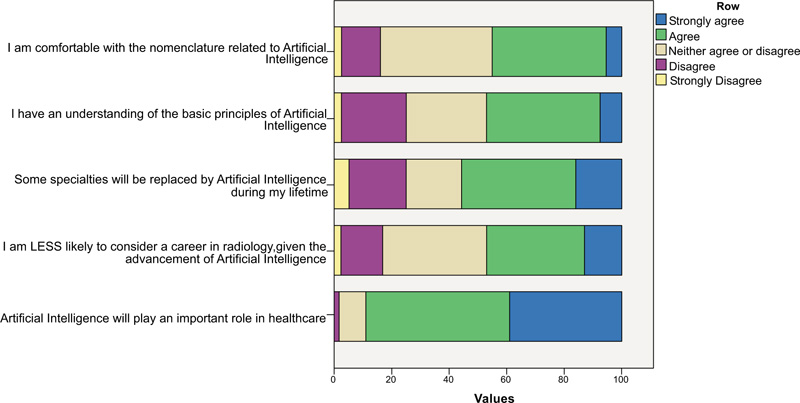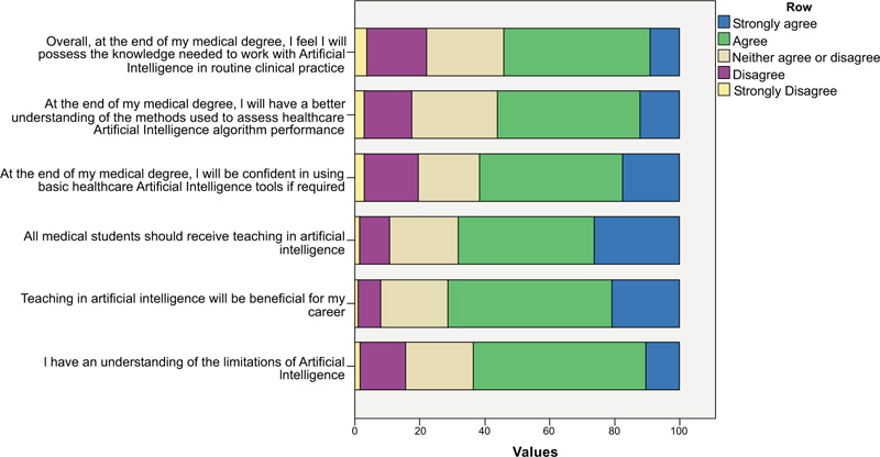 The rest of the survey contained 21, 5-point Likert questions(1= strongly disagree to 5=strongly agree) whereby participants rated their agreement towards a presented statement related to their current attitudes towards AI, their career intentions towards radiology, their current understanding of AI, and their confidence in using AI tools in a routine and critical manner following graduation. Dichotomous questioning was used to determine if participants received training on AI and if this teaching formed a compulsory part of their curriculum.
