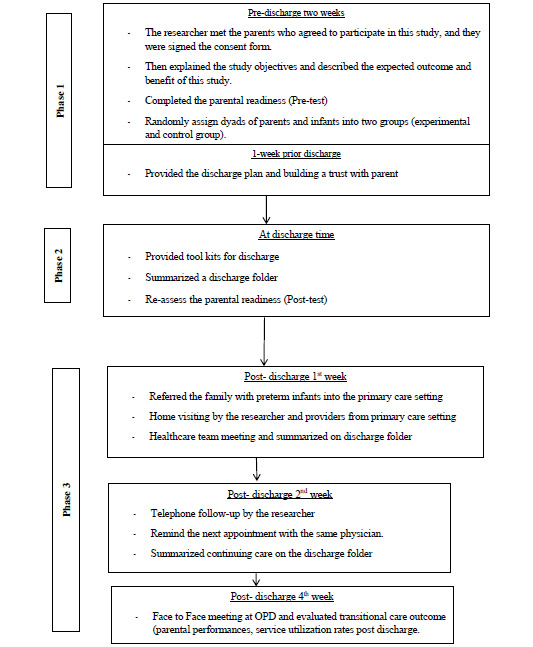 Phase 1 was initiated two weeks before discharge. The parents in the experimental group received a discharge tool kit (such as a thermometer, a bulb syringe, and a preterm infant handbook). The researcher explained the learning method and demonstrated how to take care of their preterm infant, including the feeding pattern, maintaining body temperature, maintaining respiratory control, bathing, dressing, and learning about the response of the preterm infant and his or her behavior. Families received an individualized training course in order to gain more hands-on experience with the parents three times a week and this took place 20 minutes/day. The discharge teaching used a preterm infant handbook and a clip video with a flipchart to explain the preterm infant's behavior. Subsequently, the researcher made an appointment to set a schedule to evaluate the parents’ knowledge in the next week. At one week before discharge, the researcher encouraged the parents to use the discharge tool kit to learn about the timetable for adjusting the complex medication at home and home environment preparation, for example the bed and crib using the flipchart. Moreover, crucial data about cardiopulmonary resuscitation were taught using a clip video. The parents in the control group received only routine nursing care. They received discharge teaching in three sessions (such as hygiene care, feeding skills, and first-aid). The duration of each session was 20 minutes. However, the issues of neonatal readiness and content for basic preterm infant care were catered by different healthcare teams that had their duty on the discharge day.
