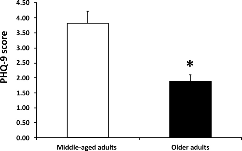 The level of depression in middle-aged and older adults is shown in Fig. (2). In this study, the depression score was determined using the PHQ-9. An increase in the PHQ-9 score is correlated with an increased severity of the depression level. The result of this study showed that the PHQ-9 score was significantly lower in older adults than in middle-aged ones. This result suggested that the level of depression was significantly reduced in the older adults when compared with the middle-aged ones (Fig. 2).