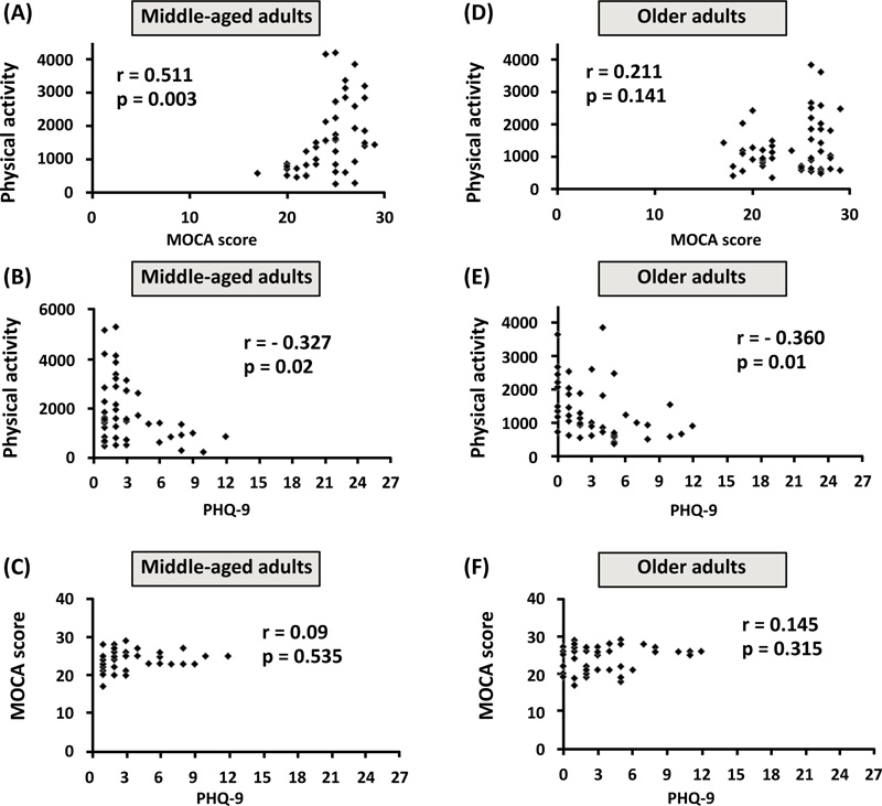 In the results, older adults showed that the PHQ-9 score was associated negatively with physical activity (r = -0.36, p = 0.01) (Fig. 4E). However, it was found that the MoCA score showed no correlation with physical activity in middle-aged adults (r = 0.211, p = 0.141) (Fig. 4D). Also, the MoCA score showed no correlation with the PHQ-9 score in older adults (r = 0.145, p = 0.315) (Fig. 4F).