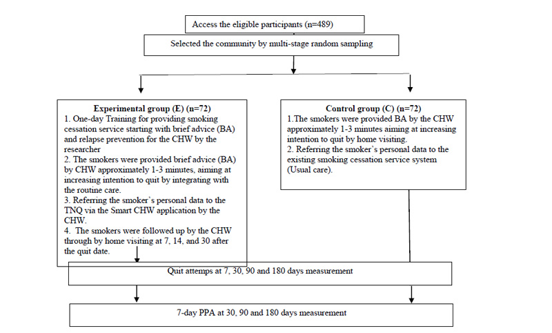 After the ECNP approved the study proposal, the researchers contacted the related organizations in the selected areas for reviewing participant’s data and data collection. Then, the researchers contacted the nurses working in the selected HPHs to screen the participants who met the name lists' criteria. The community smokers and the CHWs who meet the inclusion criteria from the name lists reported by the Health-promoting hospital were assigned to the study participants.