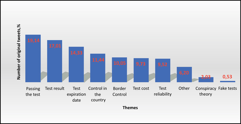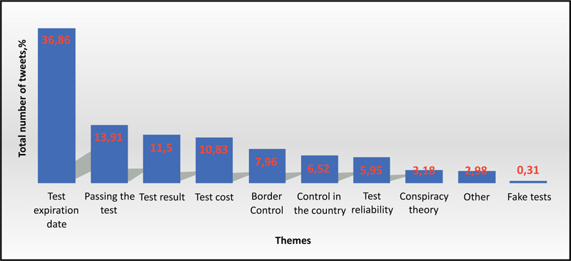 The tweets were analyzed by topic. Expert analysis of the texts (Methods and Materials) revealed nine central sub-topics related to attitudes towards PCR tests and PCR testing: 1) Test expiration date; 2) Passing the test; 3) Test result; 4) Test cost; 5) Border control (using a test to control people crossing the border); 6) Control inside the country; 7) Test reliability; 8) Conspiracy theory; 9) Fake tests. Tweets that had not been included in the listed above sub-topics made up the Miscellaneous group.
