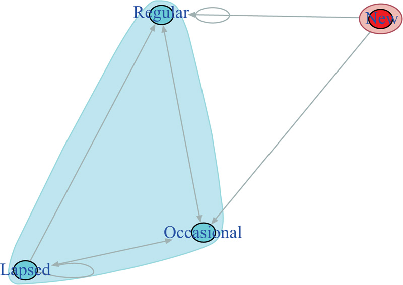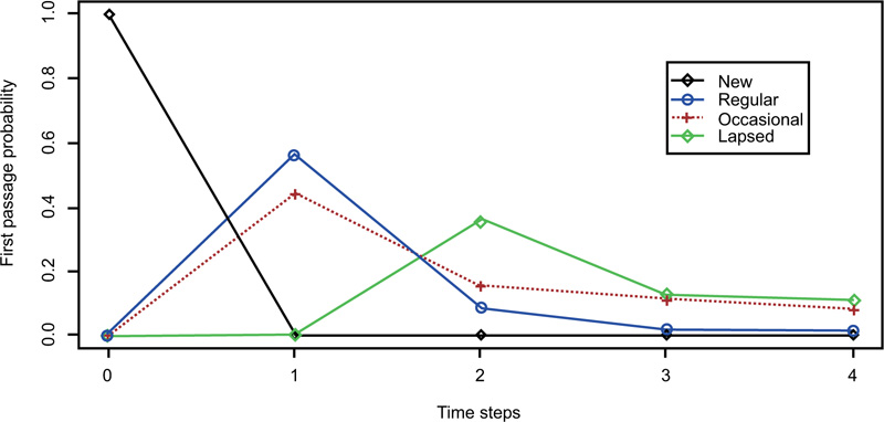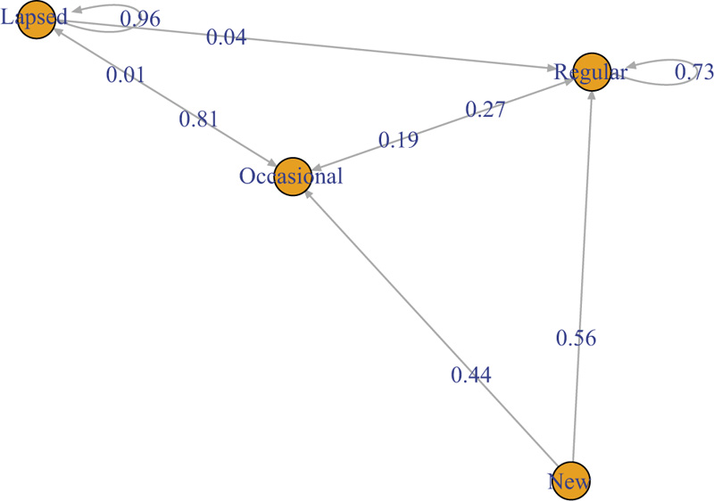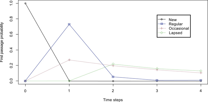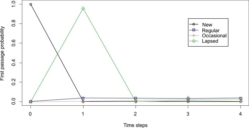 About 56% of new donors made at least one repeat donation and became regular donors within the first year, and the numbers gradually declined with time, whilst the lapsed donors increased from 35.6% in the second year to 55.6% in year 4. The long-run probabilities tell the same, with 80.9% of blood donations becoming lapsed in the long run. Depending on the current state of donation, new or regular donations will likely move to the regular donation state in the following time step (year). On the other end, occasional and lapsed donations have a higher probability of entering the lapsed donation state in the following time step (year).