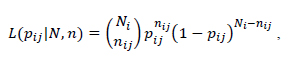 Based on the Markov principle, the transition events are independent of one another and hence the likelihood of the transition probability, pij follows a binomial model [26]. The binomial model is given in Eq. (4) as: