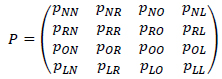 A graphical representation of the transition probabilities pij is called a transition graph or diagram. Each possible state of i, j ϵ S, where S = {N, R, O, L} is represented by a circle, and the probabilities of non-zero transitions between the different states are represented by arrows. The graph helps to easily classify the states into recurrent and transient states, and so on.
