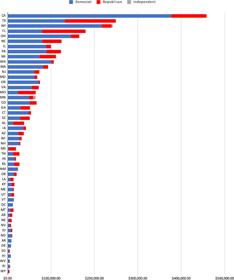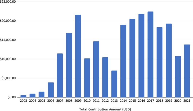Unique dietetic contribution dollars directly to political parties (including ADAPAC/ANDPAC) from 2003-2021 were categorized by location and political affiliation as shown in Fig. (4). The states with the highest number of contributions were California (19,148; $460,486), North Carolina (12,700; $126,412), New York (7,956; $248,319), Texas (7,548; $253,283), and Florida (5,459; $180,525). California had the highest contribution amount, roughly $207,203 more than the state with the next greatest number of contributions (Texas). The lowest number of contributions and total contribution dollars was from Wyoming (87; $4,410). When evaluating the average amount per contributor, North Dakota ($95.73) led all states, followed by Alaska ($74.66), South Carolina ($68.89), Iowa ($64.57), and New Hampshire ($61.44), with North Carolina contributing the least per contributor ($10.55). All locations demonstrated bipartisan support apart from Washington D.C., Hawaii, and Vermont, demonstrating only Democratic Party support.