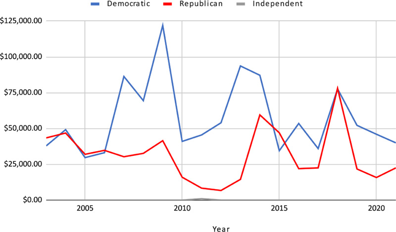 | Year | Democratic (%) | Republican (%) | Independent (%) | Total Dollar Value of Contributions | Congressional Majority | |
