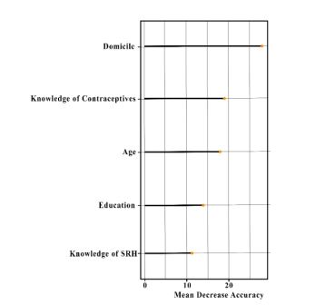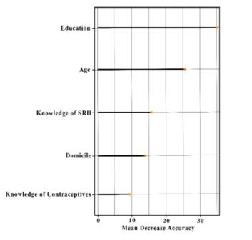 Fig. (2) shows the importance of each variable for unintended pregnancy using SMOTE-NC with 100 trees. The higher the MDA, the more important the variable is. In this case, it is education. The second most influential variable is age. This is followed by knowledge of SRH and domicile, while the least influential variable is knowledge of contraceptives. This means that knowledge of contraceptives is a variable that has the least influence over the other predictor variables.