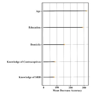 Random forest was used to classify unintended pregnancy and pre-marital sex to make a model. The model was then used to predict unintended pregnancy and pre-marital sex among adolescents. Using random forest classification, the factors that influence unintended pregnancy and pre-marital sex among adolescents were determined. Following are the results of the random forest classification.