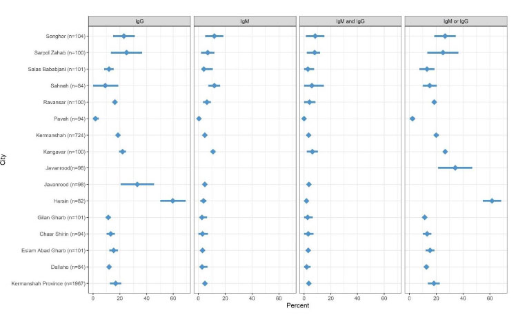 Fig. (2) shows the sample size and seroprevalence of SARS-CoV-2-specific IgG and IgM antibodies. As can be seen, the lowest IgM, IgG, IgM and IgG, and IgM or IgG seroprevalence was found in Paveh, 0.5, 1.8, 0, and 2.3, respectively. On the other hand, the highest IgM seroprevalence was found in Sahneh (11.9% [7.5–16.3]) and Songhor (5% [5–18.7]) cities. Also, the highest IgG seroprevalence was found in Harsin (59.7% [50.1–69.4]). In addition, the highest seroprevalence of SARS-CoV-2-specific IgG and IgM and IgM or IgG antibodies were related to Songhor (8.3% [1.4–15.2]) and Harsin (61.6% [54.7–68.5]); respectively.