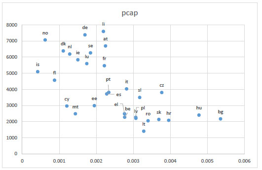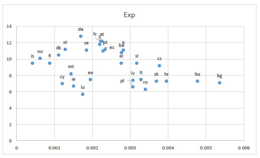 This exploratory scatterplot indicates the presence of a relationship where higher-spenders (or presumably better-resourced healthcare systems) are, as expected, at the lower end of the European Covid mortality spectrum. However, the relationship is not universal. Thus, some high-spenders countries such as Sweden, achieve only marginally better results than low-spenders like Estonia. However, the very low-spenders, Croatia, Hungary, and Bulgaria appear to be among the most pronounced underperformers among low-spenders, based on the GDP indicator.