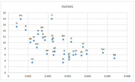 The penultimate variable examined here in relation to European country Covid mortality rates concerns the resourcing variable of nurses, per 1,000 inhabitants, which has again been collected by the OECD. The importance of the relative number of nurses in the Covid pandemic has been highlighted by other authors and we follow this lead [11]. Fig. (6) confirms these views by showing a high negative correlation between a high relative number of nursing staff in a national health system and a low country mortality rate.