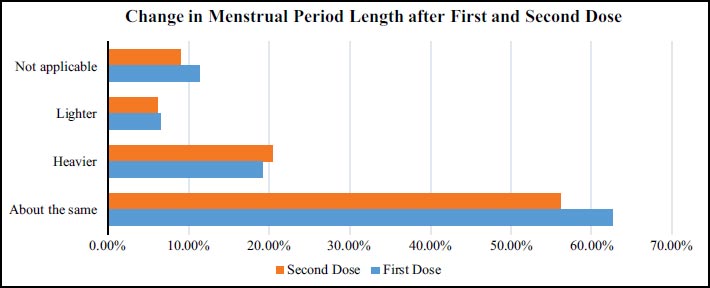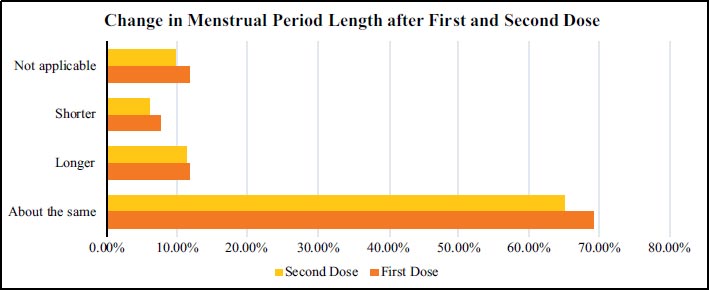 The results partially confirmed the findings from prior studies that COVID-19 vaccination is associated with significant changes in the women’s menstrual cycle flow and menstrual period length even after controlling for age, Body Mass Index, and ethnicity. Other menstrual cycle disturbances such as missed periods, cycle regularity, and spotting/vaginal bleeding were noted to be less significant. However, the extent of menstrual cycle changes was less severe and decreased after the second dose of vaccination. It was found that 11.1% and 37.5% of post-menopausal women reported menstrual symptoms after the first and second dose cycles, respectively.