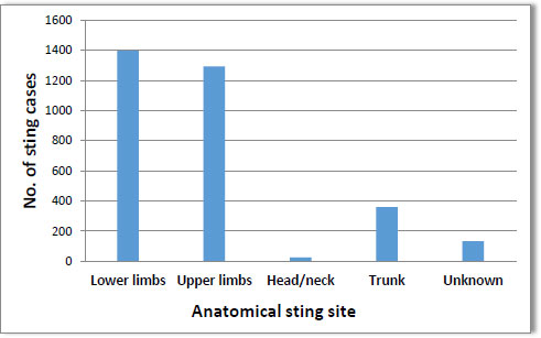 According to the anatomical sting site of the scorpion, we reported mainly on the hands and feet [84%]. This feature was similar in all epidemiological studies conducted in Iran [5, 23, 26, 29, 30]. This characteristic somehow means that people can encounter scorpions while wearing shoes, unintentionally touching hands or feet with scorpions while walking or picking up objects [23, 25]. In this case, observing tips, such as shaking shoes before wearing, putting shoes in a shoe rack, shaking clothes and bedding before using, and using gloves and boots during agriculture, can prevent scorpion stings [13].
