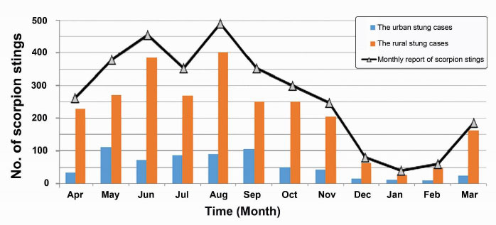 The epidemiologic data showed that sting cases mainly reached to peak at the beginning of the hot season. Other epidemiological studies on scorpion stings in Iran and worldwide also mentioned the same results [23, 25, 31, 32]. In general, the weather conditions of the southern regions of Iran, especially in the hot seasons and the coolness of the interior of the houses, cause scorpions to enter the houses and shelter them inside the houses, subsequently leading to scorpion stings [13]. In addition, the activity of scorpions also begins when the weather warms up in spring [6].