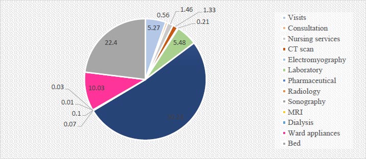 The results showed that among the types of services, pharmaceutical services accounted for 40.74% of the total cost (i.e., 10,272,282,858 Rials equivalent to $244,578.16) and 50.23% of the patients' contribution (i.e., 11,860,31713 Rials equivalent to $28,238.85). These two costs accounted for the highest values of total costs and OOP (Tables 3 and 4, Fig. 2).