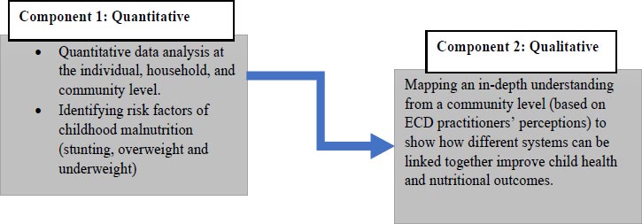 A sequential mixed methods approach was used. For the quantitative method, we did a cross-sectional descriptive analysis of 2 966 children who were under-five years' old in the 2017 South African National Income Dynamics Study (NIDS) between July and August 2022, we conducted five in-depth interviews with ECD practitioners using this qualitative method, and the data was analyzed using thematic analysis. Data was triangulated to understand the factors influencing children’s nutritional outcomes and to provide the narratives of ECD practitioners. This enabled us to highlight challenges and opportunities in linking children to services they need.