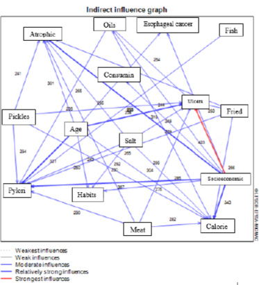 The analytical results of this matrix, the most influential factors were socio-economic status (income and level of education), age, meat (red, smoked, and processed), and salt. Moreover, the most affected factors were gastric ulcers, Helicobacter pylori, excessive daily calorie intake, and chronic atrophic gastritis.