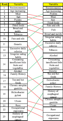 According to the findings, the following 13 factors had the highest effect on the incidence of gastric cancer: socioeconomic status, age, consumption of pickles and sour vegetables, salt consumption, meat consumption (red, smoked, and processed and salty), consumption of fried foods, consumption of fats and oils, consumption of fish (Salty, smoked, and processed), consumption of bread and leftovers and moldy foods, irregular eating habits, excessive daily calorie intake, smoking (cigarettes, opium, and hookah), and alcohol consumption.