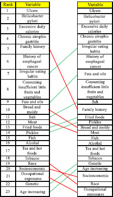 In the ranking phase of the study, 23 gastric cancer risk factors were examined and analyzed.