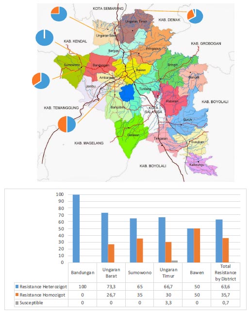 The results showed that the resistant samples were 48.4% heterozygous and 51.6% homozygous resistant from Bawen, 100% heterozygous resistant from Bandungan, 73.3% heterozygous and 26.7% homozygous resistant from West Ungaran, 65% heterozygous and 35% homozygous resistant from Sumowono, 23.3% heterozygous and 66.7% homozygous resistant, and 10% still susceptible from Ambarawa, and 30% heterozygous and 70% homozygous resistant from East Ungaran districts.