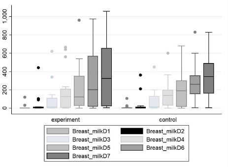 The result showed that in the frequency of milk expression daily, the experiment group had a median frequency of 2.5 (IQR 1,4) on day 1, which was slightly lower than the control group’s median frequency of 3 (IQR 2,4), although this difference was not statistically significant (p=0.605). Similarly, the experiment group’s median frequency was comparable to the control group’s median frequency for days 2-7, and the differences were not statistically significant (p>0.05). Regarding breast milk volume, there was no significant difference in median breast milk volume between the experiment and control groups on any of the seven days (p>0.05). On day 1, the experiment group had a median breast milk volume of 0.1 (IQR 0, 2.11), while the control group had a median breast milk volume of 0 (IQR 0, 4.6). However, the difference was not statistically significant (p=0.803). Similarly, on days 2-7, the median breast milk volume was comparable between the two groups, and the differences were not statistically significant (p>0.05), as shown in Table 2 and Fig. (2).