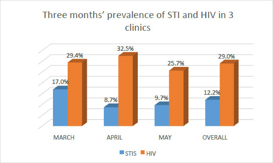 The prevalence of STIs including HIV in the three clinics over the three month period was found to be high. The prevalence of STIs in the Seventh Day Adventist clinic was the highest of the three clinics. The prevalence varied across three months with cumulative prevalence of 17.0%, 8.7%, and 9.7% respectively. The overall cumulative and comparative prevalence in the three months and in the three clinics was 12.2% for STIs against 29.0% for HIV. There was low uptake of STI treatment, inconsistent use of condoms, and the practice of having multiple sexual partners among pregnant women.