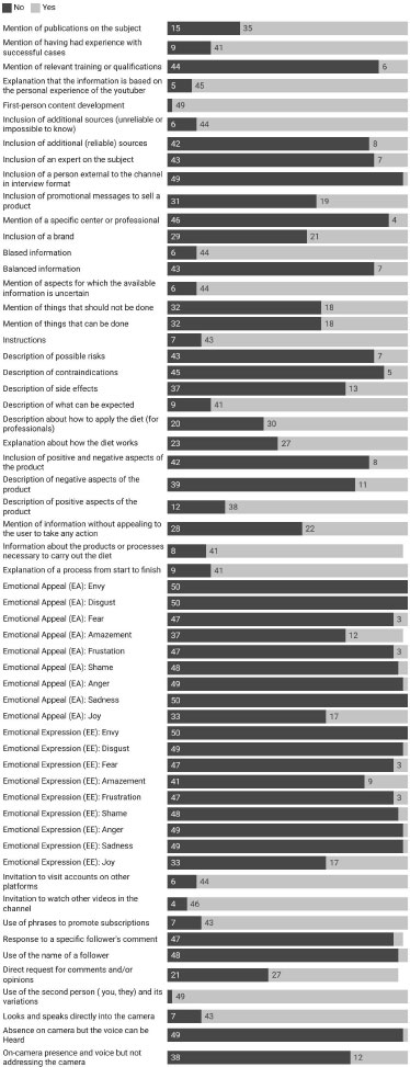 Videos showing negative aspects or potential side effects, risks, or contraindications are not abundant. Biased information predominates, and expert opinions, interviews, or additional reliable information sources are not usually included. Likewise, the videos are very personal, alluding to previous experiences and speaking in the first person. Finally, although there is a certain promotional component, it is not predominant. All of the above is shown in a disaggregated and visual form in Fig. (2).