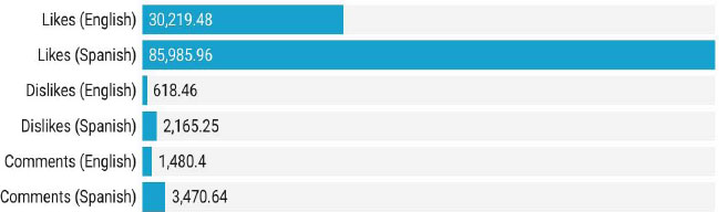 Although not abundant, some significant differences between the videos in both languages were observed. The Spanish videos (M=85985.96; SD=107849.012) had a higher volume of likes than the English videos (M=30219.48; SD=44470.015), [t(31,932)=-2.390, p<.05, d=.68]. Also, the number of dislikes is higher in Spanish videos (M=2165.25; SD=282222.264) than in English (M=618.46; SD=816.080), [t(26,819)=-2.579, p<.05, d=.74]. Moreover, the same is true for the number of comments (MESP=3470.64; SDESP=3563.911; MING=1480.40; SDING=1627.641), [t(33.594)=-2.540, p<.05, d=.72]. Although the number of views is not significantly different, there is a trend difference towards a higher average number of views in Spanish videos, which could indicate that, in general, Spanish videos seem to receive more attention and interaction (Fig. 3).