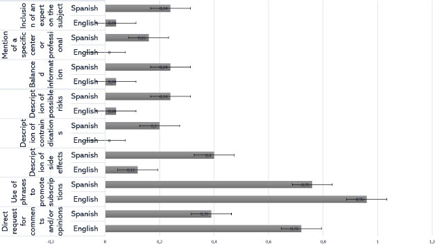 For its part, the description of side effects is more frequent in the videos in Spanish (M=.40; SD=.500) than in English (M=.12; SD=.332), [t(41,694)=-2.333, p<.05, d=.66]. The same is true for the description of contraindications (MSPA=.20; SDSPA=.408; MENG=.00; SDENG=.000), [t(24,000)=-2.449, p<.05] and of possible risks (MSPA=.24; SDSPA=.436; MENG=.04; SDENG=.200), [t(33,676)=-2.085, p<.05, d=.59]. Also balanced information is more common in Spanish videos (M=.24; SD=.436) than in English (M=.04; SD=.200) [t(33.676)=-2.085, p<.05, d=.59].
