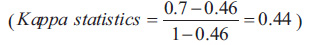 Therefore, in our example in Table 2, the kappa statistic is equal to 0.44.