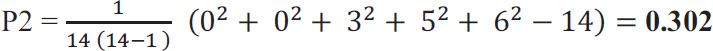 Example 2: fourteen dentists give grades from 1 to 5 about the severity of a tooth's damage. If 5 patients are examined, the statistical value of Fleiss' kappa is calculated below (Table 4).