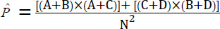 To calculate the expected agreement (), in each row and column, the sum of rows and columns is calculated, then the sum of the first row is multiplied by the sum of the first column and the sum of the second column is also multiplied by the sum of the second row. The resulting products are added together and divided by the square of the sample size. Below is the formula for calculating the expected agreement and Cohen's kappa: (Eq 2)
