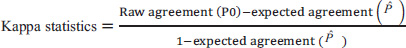 The range of values for Kappa statistics is between -1 to 1 [12, 13]. If the values are less than zero, it indicates no agreement, values between 0.6 and 0.8 indicate moderate agreement and values greater than 0.8 mean nearly complete agreement [9]. A generalized form of Cohen's kappa statistic for more than two raters was introduced by Fleiss in 1970, known as Fleiss's kappa [7, 13].