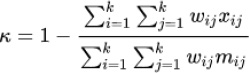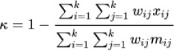 where k = number of codes and Wij, Xij and Mij are elements in the weight, observed, and expected matrices, respectively. When diagonal cells contain weights of 0 and all off-diagonal cells weights of 1, this formula produces the same value of kappa as the calculation given above (Figs. 1 and 2).