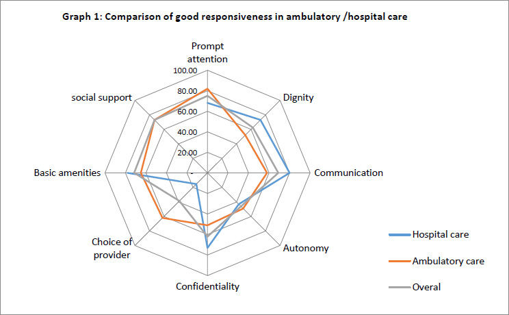 Graph (1). Comparison of good responsiveness in ambulatory (N=240)/hospital care (N=100). (Note: Social support is just applicable for hospital care).