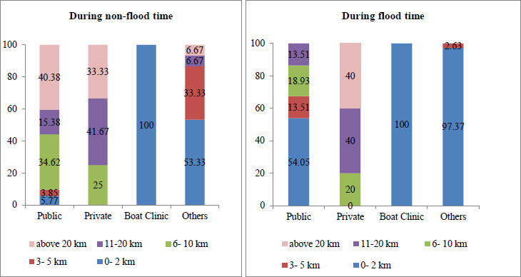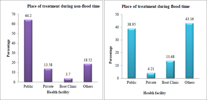 Overall it was found that for both acute and chronic illnesses the patients mostly sought treatment from the public health facility. However, the study confirmed that next to the government health center for treatment they visited quack and traditional healers whom they met in the periphery of their village, and sometimes they traveled from house to house as well as the village to provide services in the doorstep. This finding is similar to several other studies which revealed that one of the major providers of basic health care in the rural area is the informal health care provider [34, 35]. Additionally one of the interesting health facilities found in the study area is the boat clinic that provides primary care once a month to each of the char villages. As the road connectivity was damaged the respondents reported that they could not visit the higher health facilities as a result they visited informal health care providers and boat clinics in flood times.