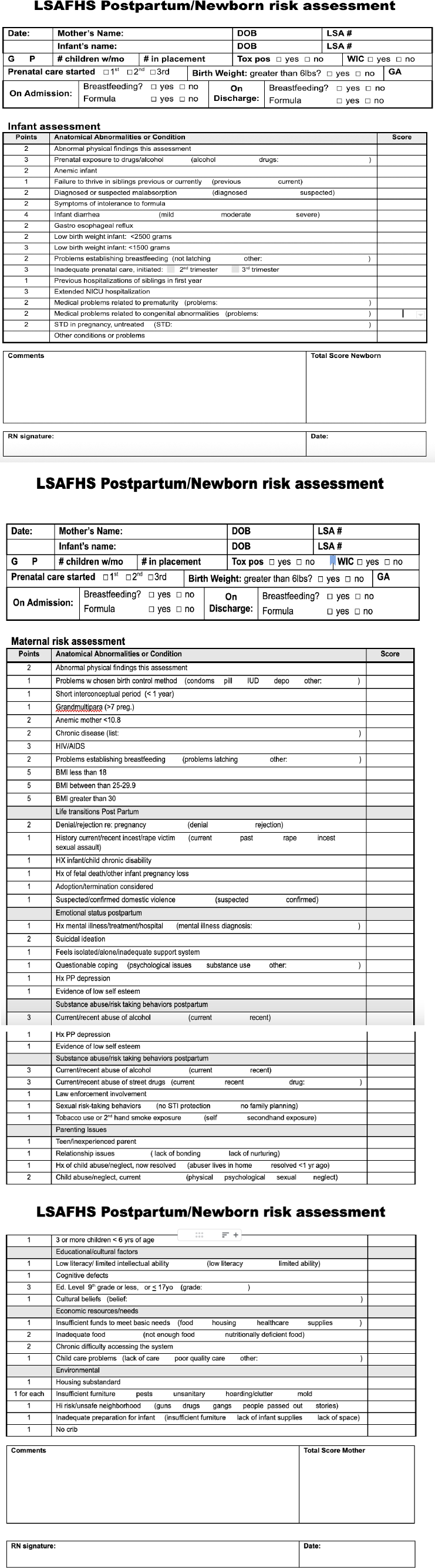 A retrospective paper chart review on MOP data from 2009-2017 of enrolled participants was conducted by trained research assistants. Prior to the chart review, LSA nurses collected various data points as part of their routine intake and follow-up process. Of particular interest were antepartum (AP) and postpartum (PP) Center for Epidemiological Studies Depression Scale (CES-D) scores, with a score of 10 or greater flagged as concerning for a future depressive episode. The CES-D has been proven as a reliable screening tool in a low-income perinatal population [12]. Also collected were social risk factors, identified with the MOP’s own screening forms, attached in the appendix. Risk factors of interest included insufficient income, substandard housing, unsafe neighborhood, less than high school education, teen/first-time parent, preeclampsia, gestational diabetes, and PP risk assessment score in our study participants. Appendix A includes the intake form with definitions of the risk factors used by LSA nurses.