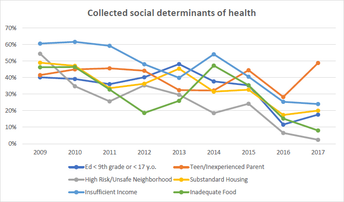 The following categories declined over the nine-year study period: high-risk/unsafe neighborhood, substandard housing, insufficient income, and inadequate food. The prevalence of “high-risk/unsafe neighborhood” ranged from its peak in 2009 at 54.40% to its trough in 2017 at 2.70%. Substandard housing saw a notable decline between 2015 and 2016 from 34.70% to 19.50%. The insufficient income category experienced two notable declines between 2011 and 2013 from 59.20% to 39.80% and again between 2014 and 2016 from 54.10% to 28.50%. The “inadequate food” category also experienced two declines between 2010 and 2012 from 46.40% to 18.60% and again between 2014 and 2017 from 47.30% to 8.90%.