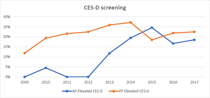 A retrospective chart review of nursing notes from 2009-2017 was conducted for this cross-sectional study. Outcome measures included antepartum (AP) and postpartum (PP) Center for Epidemiological Studies Depression Scale (CES-D) scores, with a score of > 10, suggesting a positive risk for developing depression. Data were grouped and analyzed using Microsoft Excel and SPSS software (SPSS version 23). Data have been presented as yearly population percentages scoring >10 on their CES-D screen.
