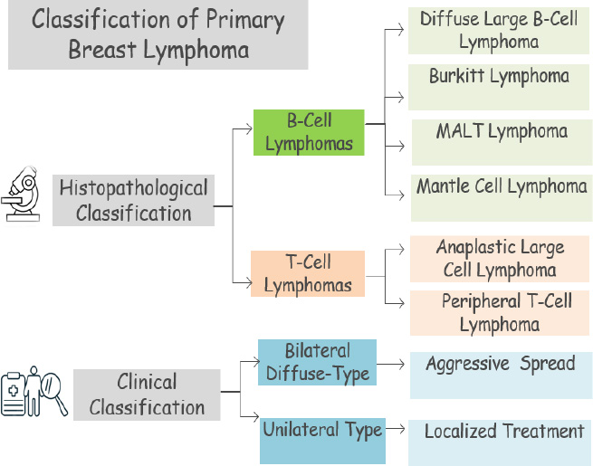 Primary breast Burkitt lymphoma (PB-BL) is rare; it accounts for 0.04-0.5% of all breast malignancies and represents 1.7-2.2% of all extra-nodal lymphomas. Primary breast lymphoma is classified based on the cell type and the clinical presentation (Fig. 1) [1]. According to the histopathological classification based on cell type, T-cell lymphoma is rare and typically arises near the site of a breast implant. The more common type is B-cell lymphoma, which accounts for approximately 90% of all cases [2].