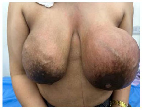 A 32-year-old female G2P2A1, with both deliveries involving a C-section, presented with progressive, painless breast enlargement. The condition initially started in the 26th week of pregnancy when she noted a gradual increase in breast size, engorgement, and heaviness with pigmentation changes. She denied having nipple discharge or skin changes. The symptoms were more pronounced on the left side of the breast. Despite seeking advice at multiple clinics, she was reassured that the symptoms were related to hormonal changes in pregnancy. However, after giving birth, her symptoms became significantly worse. She had rapid, painful breast enlargement, accompanied by a low-grade fever persisting for 4 months postpartum.