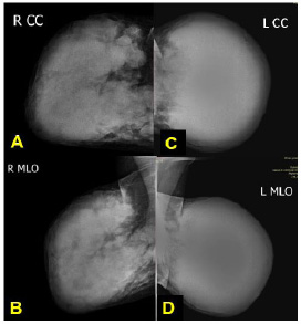 Right breast: the largest mass measured 7×4× and 5×3.7 cm.