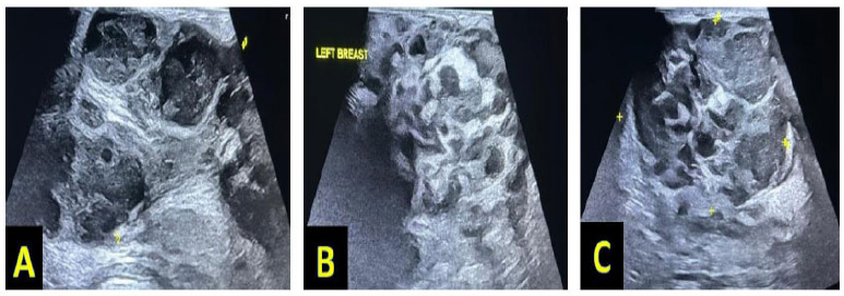 (A) Right breast showed a loss of normal breast tissue architecture with multiple partially circumscribed round-shaped heterogenous masses, mainly hypoechoic in texture and at subareolar region extending into axillary tail region, seen matted together forming large masses, with the largest one measuring about 7x 4, 5x 3.7 cm, showing posterior enhancement, with peripheral and internal few vascularities, and the masses being suspicious of malignancy, categorized as BIRADS 4c. (B,C) Left breast showed loss of normal breast tissue architecture replaced by multiple round to oval-shaped partially circumscribed heterogeneous masses, being mainly hypoechoic in texture and matted together, with the largest ones measuring about 10x 6, 8x 4 cm, showing posterior enhancement with few peripheral and internal vascularities, and involving the whole breast tissue region, thus causing mass effect at superficial veins and subcutaneous tissue. The masses were similar to the right breast masses, but larger in size, suspicious of underlying malignancy, and categorized as BIRADS 4c.
