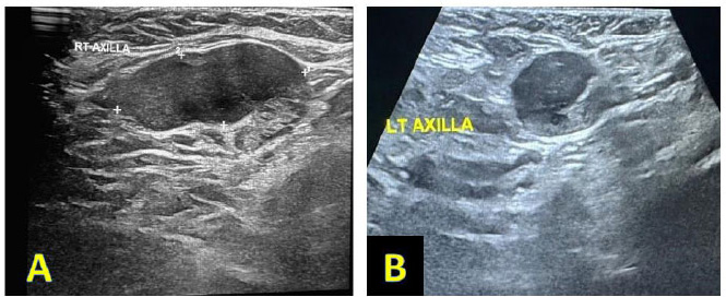 Ultrasound examination of the right (A) and left (B) axillary regions showed enlarged axillary LN being round to oval in shape; most of it showed efface distorted hilum, thick cortex being about 7-8 mm in size, with the largest one measuring about 24x17 mm, 21 x 16 mm. All of these findings were suspicious of pathological LN and fine needle aspiration (FNA) from both axillary regions.