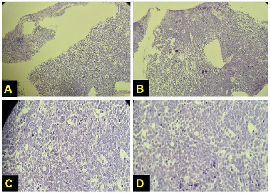 (A, B) True cut biopsy of breast (low power; X20) showed diffuse proliferation of intermediate-sized atypical lymphocytes with a focal starry sky appearance. (C, D) True cut biopsy of the breast (high power, X 40) showing diffuse proliferation of intermediate-sized atypical lymphocytes with a focal starry sky appearance.