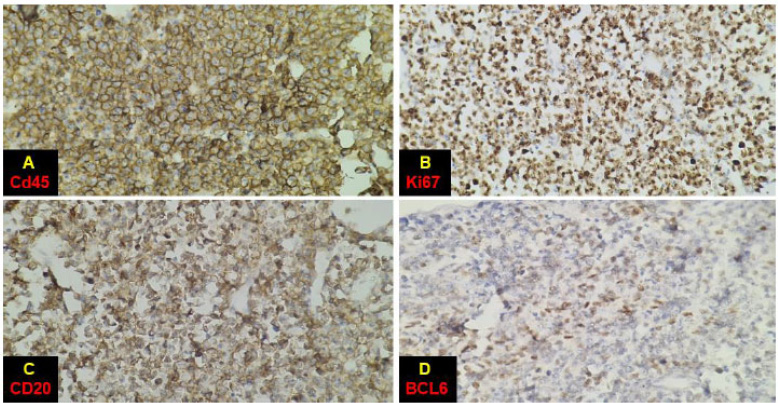 Breast histopathological slides. (A) Diffuse expression of CD45; (B) Ki67 was positive in more than 90% of cells; (C) diffuse expression of CD20 (B-cell marker); (D) expression of BCL6 (germinal center marker) in 50% of cells.
